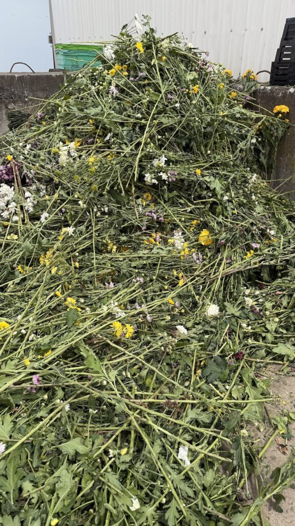 After showing off the flower farm, Burwood then showed the visitors its packhouse, with a huge pile of flowers that were to be thrown out. Given it was following Valentine’s Day, it was an example of “an extreme case” that happens at various points throughout the year, like on Mother’s Day and Christmas, says Simms.