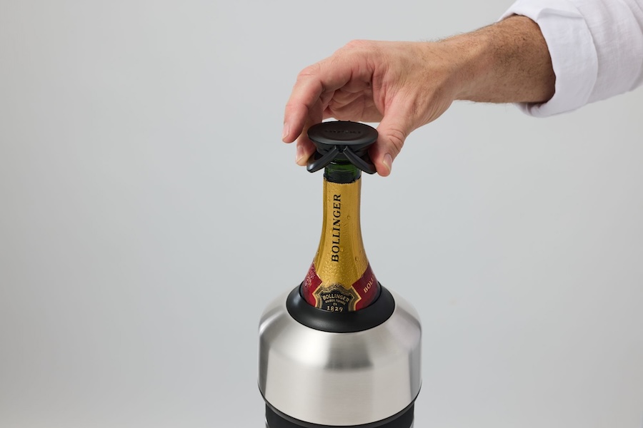 “Once opened, the carbon dioxide that creates bubbles begins to escape rapidly, especially as the wine warms. Our champagne cooler not only maintains the ideal temperature range for up to six hours without ice, it also features the patent-pending BubbleLock Bottle Stopper, which helps slow the loss of effervescence and extend the drinking experience. We believe it’s a world-first feature.”