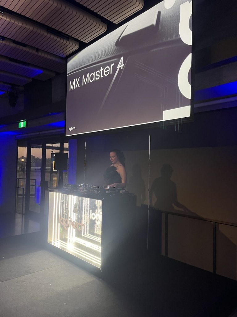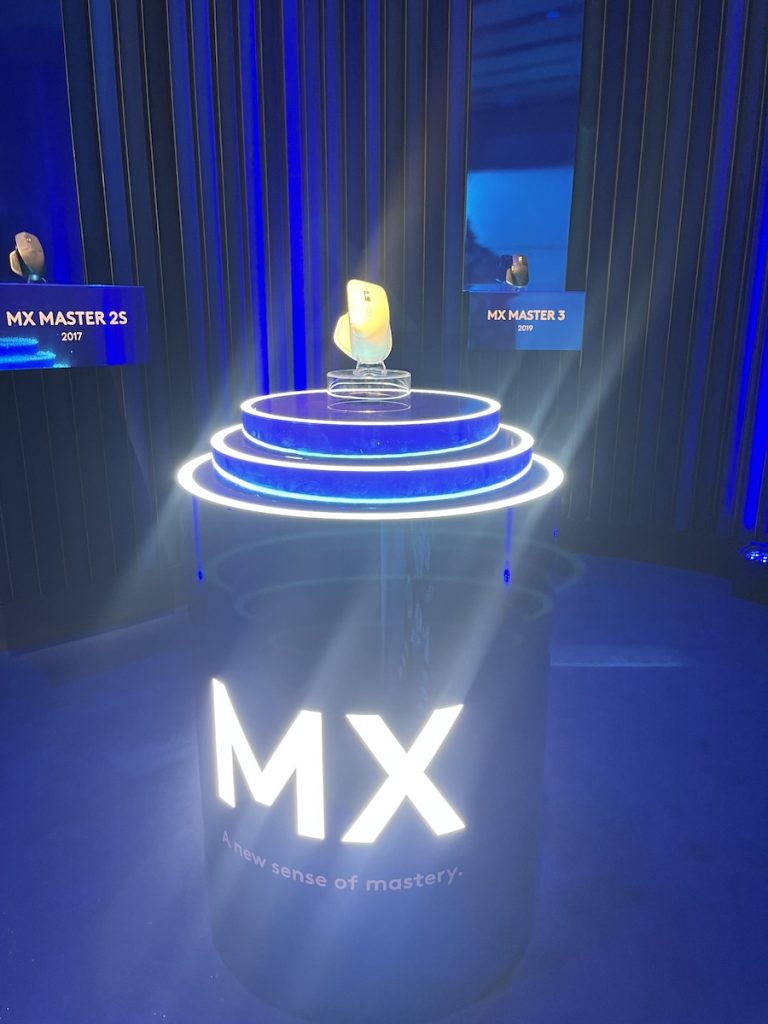 A low-lit corridor opened up to sparkling wine, a DJ mixing beats and the MX Master 4 projected on a big screen.